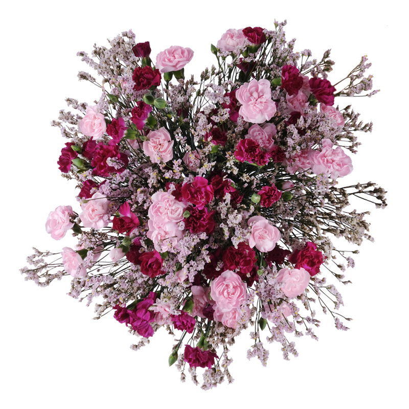 Bukiet „Z nutą goździka” to lekka, świeża kompozycja z goździków gałązkowych uzupełnionych sezonowymi dodatkami, które zmieniają się w rytmie natury.
